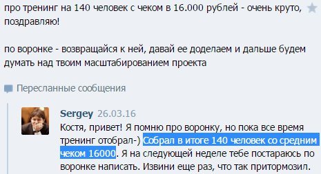 Результат: 140 человек на тренинг со средним чеком в 16 тысяч рублей (это 2 миллиона 240 тысяч рублей)
